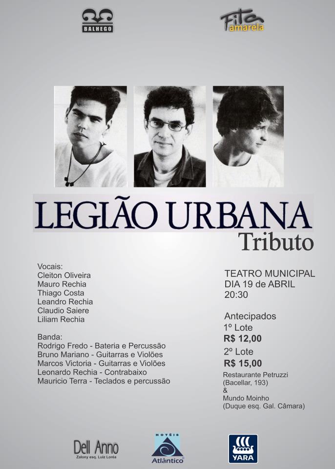 O projeto Rio Grande Mais Cultura apresenta nesta sexta-feira, 19 de abril, às 20h30, no Teatro Municipal, o espetáculo Legião Urbana Tributo. O evento tem co-produção do Coletivo Fita Amarela e conta com os músicos Rodrigo Fredo, Bruno Mariano, Maurício Terra, Marcos Victoria e Leonardo Rechia na banda e Cleiton Oliveira, Mauro Rechia, Thiago Costa, Leandro Rechia, Claudio Saiere e Liliam Rechia nos vocais. Os ingressos antecipados custam R$12 (1º lote) e R$15 (2º lote) no bar Mundo Moinho (General Câmara, 401) e no restaurante Petruzzi (Bacelar, 193).